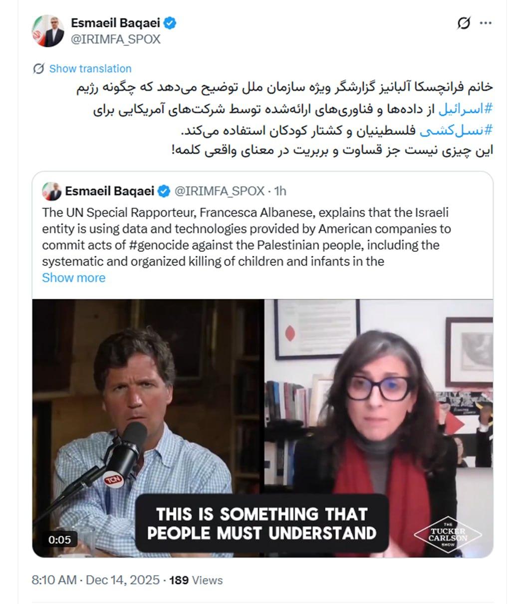 ایران آنلاین:  اسماعیل بقائی سخنگوی وزارت امور خارجه در پیامی در شبکه ایکس در خصوص تمرکز رژیم صهیونیستی بر کشتار حداکثری کودکان با بهره‌گیری از فناوری‌ها و داده‌های ارائه‌شده از سوی شرکت‌های آمریکایی نوشت: «خانم فرانچسکا آلبانیز گزارشگر ویژه سازمان ملل توضیح می‌دهد که چگونه رژیم #اسرائیل از داده‌ها و فناوری‌های ارائه‌شده توسط شرکت‌های آمریکایی برای #نسل‌کشی فلسطینیان و کشتار کودکان استفاده می‌کند.