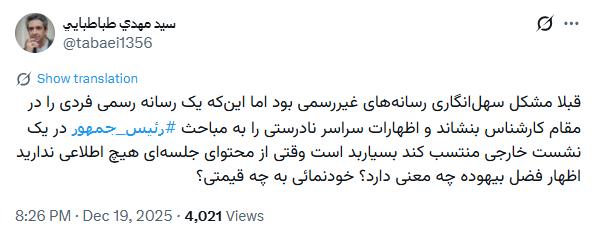 «قبلا مشکل، سهل‌انگاری رسانه‌های غیررسمی بود اما این‌که یک رسانه رسمی فردی را در مقام کارشناس بنشاند و اظهارات سراسر نادرستی را به مباحث رئیس‌جمهور در یک نشست خارجی منتسب کند بسیار بد است. وقتی از محتوای جلسه‌ای هیچ اطلاعی ندارید اظهار فضل بیهوده چه معنی دارد؟ خودنمایی به چه قیمتی؟»