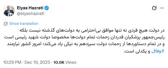 ایران آنلاین: متن پیام الیاس حضرتی، رئیس شورای اطلاعرسانی دولت، به این شرح است: