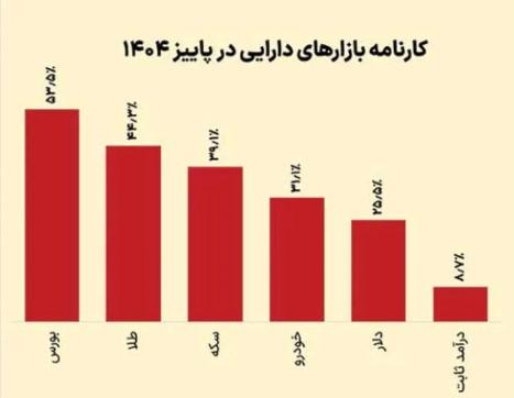 در این فضا، بورس با ثبت بازدهی ۵۳ درصدی در پاییز ۱۴۰۴ نه‌تنها بالاترین بازدهی را در میان بازارها به ثبت رساند، بلکه به لیدر این موج تورمی تبدیل شد. اهمیت این عدد زمانی بیشتر نمایان می‌شود که بدانیم چنین رشدی در پاییزهای گذشته بازار سرمایه سابقه نداشته و بیانگر شدت واکنش بورس به ترکیبی از تورم، تغییر انتظارات و متغیرهای سیاستی است. در کنار بورس، طلا نیز با رشد حدود ۴۴ درصدی، عملکردی شارپ و قابل‌توجه داشت. این بازار مطابق الگوی سنتی خود، در دوره‌های تورم بالا به ‌عنوان پناهگاه حفظ ارزش دارایی ظاهر شد و توانست بخش مهمی از فشار تورمی را در قیمت‌ها منعکس کند. با این حال، فاصله بازدهی طلا با بورس نشان داد که سرمایه‌گذاران صرفاً به دنبال پوشش تورم نبودند، بلکه در پی بازاری با ظرفیت رشد بالاتر و افق سودآوری گسترده‌تر حرکت کردند.