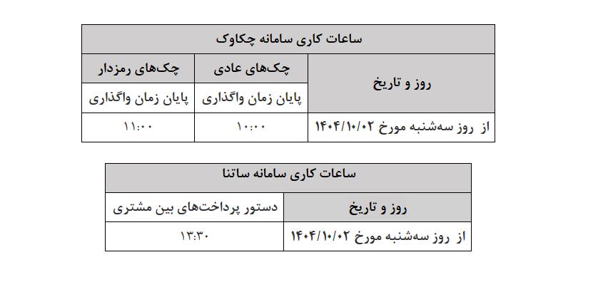 ایران آنلاین: با توجه به بخشنامه سازمان امور اداری و استخدامی کشور موضوع ماده (۵) قانون مدیریت خدمات کشوری مبنی‌ بر تغییر ساعات کاری بانک‌ها و ادارات، ساعات‌ ارائه خدمت سامانه‌های «چکاوک» و «ساتنا» از روز سه‌شنبه مورخ ۰۲ /۱۰ /۱۴۰۴ تا ۱۵ /۰۱ /۱۴۰۵، به شرح جداول ذیل تغییر کرده است: