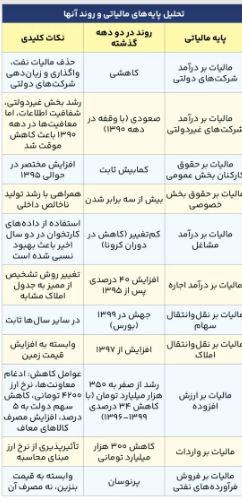 بررسی پایه‌های مالیاتی در ایران منبع درآمدهای مالیاتی را نشان می‌دهد و از سوی دیگر میزان افزایش و کاهش آن را نیز منعکس می‌کند. بخشی از گزارش پیش رو به این موضوع اختصاص یافته است.
