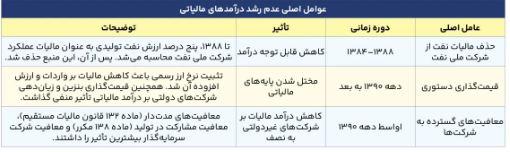 مالیات بر درآمد شرکت‌های دولتی: در سال‌های 1384 تا1388، پنج درصد از ارزش نفت تولیدی به عنوان مالیات شرکت ملی نفت لحاظ می‌شد که حدوداً نیمی از مالیات شرکت‌های دولتی را تشکیل می‌داد. همچنین، واگذاری‌ها و زیان‌دهی شرکت‌های دولتی باعث شده است درآمدهای این پایه کاهش پیدا کند.