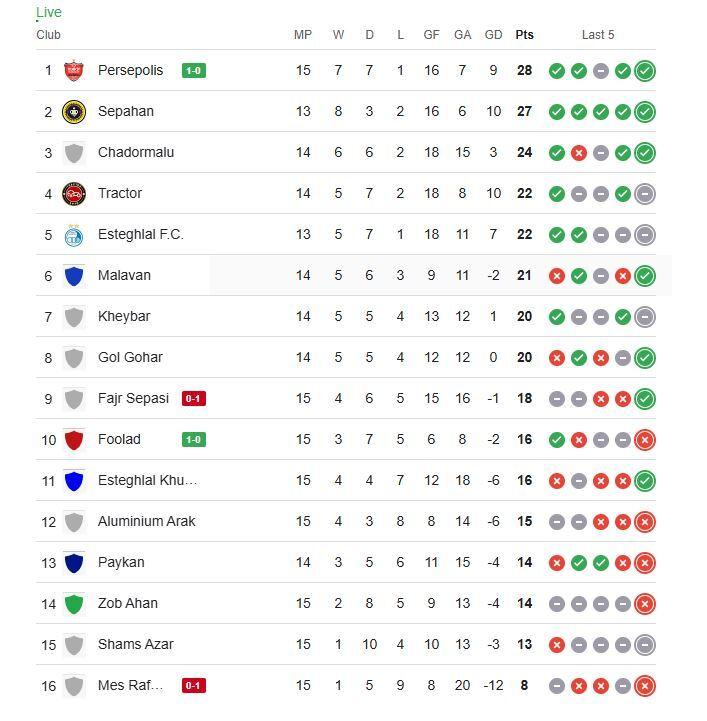 جدول لیگ برتر پس از برد پرسپولیس مقابل مس رفسنجان و تساوی تراکتور و شمس آذر
