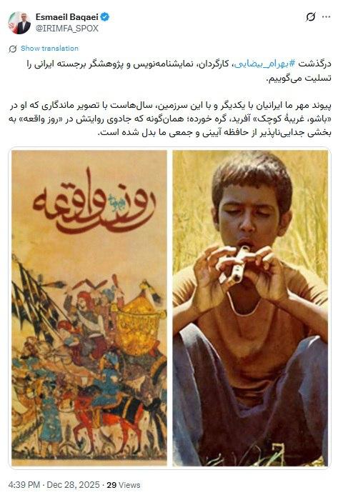 سخنگوی وزارت خارجه با انتشار نوشتهای در حساب کاربری خود در شبکه ایکس نوشت: درگذشت بهرام بیضایی، کارگردان، نمایشنامهنویس و پژوهشگر برجسته ایرانی را تسلیت میگوییم.