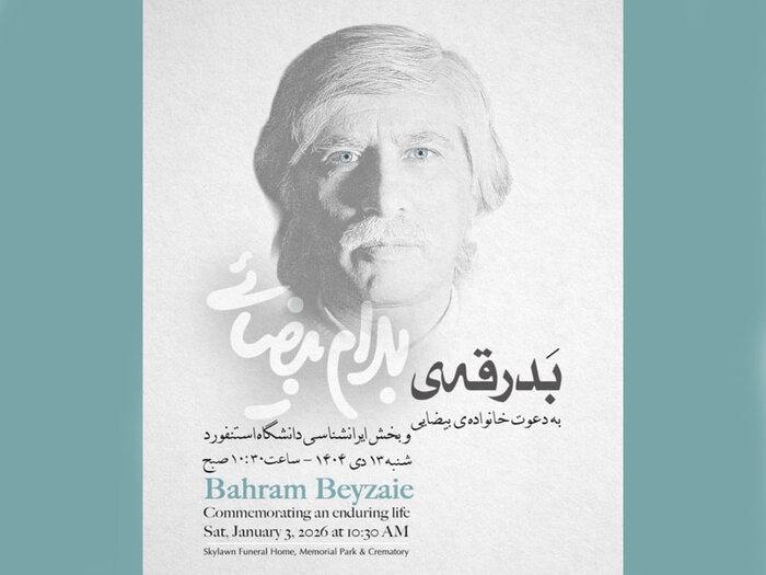 ایران آنلاین: آئین بدرقه پیکر زنده یاد بهرام بیضایی صبح شنبه ۱۳ دی مصادف با سوم ژانویه ۲۰۲۶ ساعت ۱۰:۳۰ صبح در آرامستان یادبود اسکای لان واقع در ایالات متحده آمریکا برگزار می‌شود.
