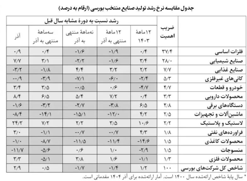 رشد شاخص تولید صنعتی شرکتهای بورسی در آذر ۲٫۹ درصد شد و رشد سهماهٔه منتهی به آذر این شاخص به ۰٫۵ درصد رسید. عمده این رشد ناشی از بهبود تولید صنایع شیمیایی رخ داد. علاوه بر این، گروه فلزات اساسی، خودروسازی، دارویی، لاستیک و پلاستیک از دیگر صنایعی بودند که با رشد تولید مثبت همراه بودند.