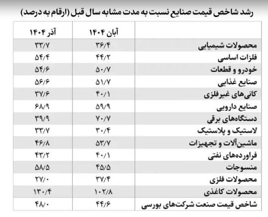 با استفاده از دادههای شرکتهای بورسی که به تفکیک محصول ارائه میشود. میتوان قیمت فروش محصولات این شرکتها را به دست آورد. با استفاده از این دادهها و به کارگیری روشهای مرسوم شاخصسازی، شاخص قیمتی به تفکیک صنایع مختلف ساخته شده است. در چهار ماه ابتدایی سال ۱۴۰۴ رشد شاخص قیمت صنعت بین ۳۵ درصد تا ۳7 درصد در نوسان بوده است؛ اما در مرداد، روند صعودی دیگری از رشد شاخص قیمت صنعت شروع شد و رشد شاخص قیمت به ۳9٫7 درصد رسید. این روند صعودی تا آذر نیز ادامه داشته و رشد شاخص قیمت در آذر نسبت به مدت مشابه سال قبل به ۴8 درصد رسیده است.