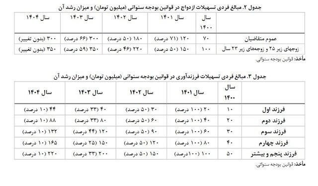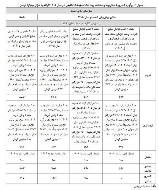 بنابراین با توجه به اهمیت پرداخت تسهیلات ازدواج و فرزندآوری و همچنین ضرورت کاهش صف متقاضیان تا حد ممکن و عدم ایجاد نارضایتی از آن محل، پیشنهاد می‌شود مبالغ فردی تسهیلات ازدواج و فرزند بدون تغییر و معادل ارقام قانون بودجه سال ۱۴۰۴ لحاظ شده اما سقف کلی تسهیلات تکلیفی معادل ۵۸۵ همت (۴۸۵ همت ازدواج و فرزند و ۱۰۰ همت اشتغال) در نظر گرفته شود. البته لازم به ذکر است که بر اساس تبصره یک ماده ۱۰ و تبصره ۴ ماده ۶۸ قانون حمایت از خانواده و جوانی جمعیت در مورد رشد ارقام تسهیلات ازدواج و فرزندآوری متناسب با تورم، اصلاح قانون یادشده به منظور تعیین محل منابع برای پوشش بار مالی آن لازم به نظر می‌رسد.