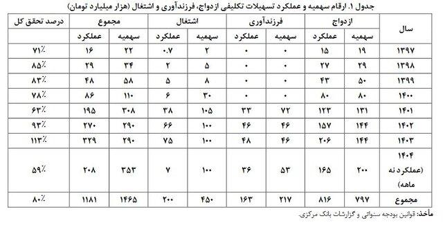 مشخص است که در اکثر سال‌ها، میزان و درصد عملکرد تسهیلات ازدواج و فرزندآوری بالا بوده است. در سال ۱۴۰۳ به علت صف زیاد متقاضیان وام ازدواج و فرزندآوری، ۵۰ همت سپرده قانونی بانک‌ها و موسسات اعتباری توسط بانک مرکزی آزاد شد که باعث عملکرد بیش از ۱۰۰ درصدی شبکه بانکی شده است. در سال ۱۴۰۴ نیز عملکرد پرداختی تسهیلات ازدواج و فرزندآوری، برخلاف اشتغال بر اساس سهمیه ابلاغی، مناسب است اما مهمترین مشکل، عدم تکافوی سقف‌های کلی مندرج در قانون برای تسهیلات تکلیفی است که باعث شکلگیری صف بیش از یک میلیون نفری دریافت‌کنندگان تسهیلات ازدواج و فرزندآوری شده است.