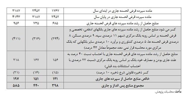 در محاسبه منابع قرض‌الحسنه پس‌انداز، منابع بانک‌های قرض الحسنه طبق رویه بانک مرکزی با ضریب ۰.۳ محاسبه شده به طوریکه تنها ۳۰ درصد ظرفیت تسهیلات‌دهی قرض الحسنه آنها برای تسهیلات تکلیفی لحاظ شده است. دلیل این امر آن است که این بانک‌ها در ازای سپرده‌های قرض الحسنه پس انداز، امتیاز دریافت تسهیلات را به صاحبان سپرده‌ها واگذار می‌کنند. بنابراین امکان پرداخت تسهیلات تکلیفی از محل سپرده‌های امتیازی برای آنها وجود ندارد.