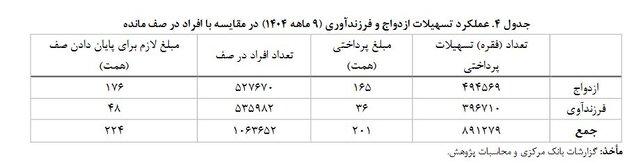 علی رغم رشد بالای مبالغ یاد شده برای سال‌های قبل، در سال ۱۴۰۴ این مبالغ برای ازدواج افزایش نداشته و برای فرزندآوری نیز تنها ۱۰ درصد رشد داشته است. عدم رشد مبالغ انفرادی مانع از تشکیل صف طویل دریافت تسهیلات ازدواج و فرزندآوری نشده و معضل جدی در این زمینه وجود دارد.
