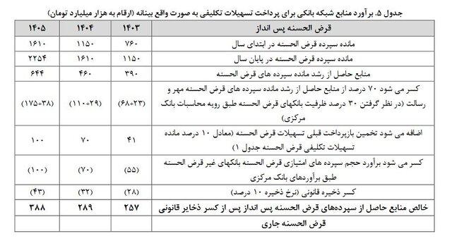 رشد سپرده‌های پس انداز دو بانک قرض الحسنه مهر و رسالت برای سال‌های ۱۴۰۴ و ۱۴۰۵ معادل رشد سپرده‌های پس انداز آنها در سال ۱۴۰۳ به ترتیب معادل ۶۱ و ۲۷ درصد لحاظ شده که با لحاظ تعدیل ۷۰ درصد مزبور، از مجموع مانده سپرده‌ها کسر شده است. (۳۰ درصد آن به عنوان منبع در نظر گرفته شده است)