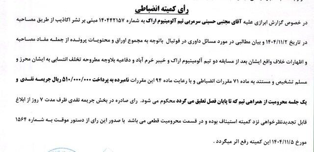 به گزارش ایسنا، رای تخلف مجتبی حسینی سرمربی تیم آلومینیوم به شرح زیر است: