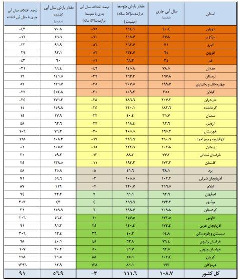 همچنین ارتفاع کل ریزش‌های جوی کشور معادل ۱۰۸.۷ میلیمتر است. این مقدار بارندگی در دوره‌های مشابه درازمدت ۱۱۱.۶ میلیمتر و در دوره مشابه سال آبی گذشته ۵۶.۹ میلیمتر را نشان می‌دهد. طبق این آمار میزان بارش‌ها در ۵ استان صفر بوده است.