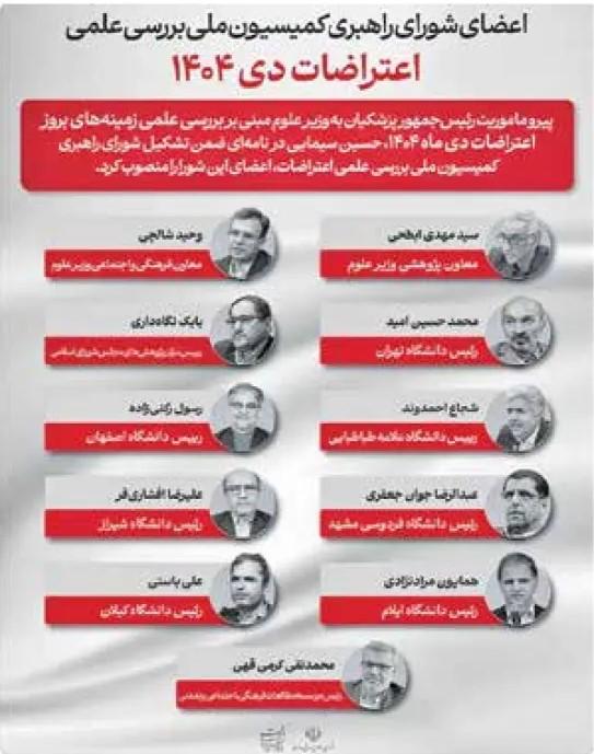 روز شنبه هفته جاری وزیر علوم نیز در نامهای اعضای شورای راهبری «کمیسیون ملی بررسی علمی اعتراضات» را معرفی کرد؛ کمیسیونی که قرار است بازوی فکری و تحلیلی دولت در این حوزه باشد. در ترکیب این شورا، دکتر سید مهدی ابطحی معاون پژوهشی وزارت علوم، دکتر وحید شالچی معاون فرهنگی و اجتماعی وزارت علوم، دکتر محمدحسین امید رئیس دانشگاه تهران، دکتر شجاع احمدوند رئیس دانشگاه علامه طباطبائی، دکتر بابک نگاهداری رئیس مرکز پژوهشهای مجلس شورای اسلامی، دکتر رسول رکنیزاده رئیس دانشگاه اصفهان، دکتر عبدالرضا جوان جعفری رئیس دانشگاه فردوسی مشهد، دکتر علیرضا افشاریفر رئیس دانشگاه شیراز، دکتر همایون مراد نژادی رئیس دانشگاه ایلام، دکتر علی باستی رئیس دانشگاه گیلان و دکتر محمدتقی کرمی فقهی رئیس مؤسسه مطالعات فرهنگی، اجتماعی و تمدنی بهعنوان اعضای شورای راهبری کمیسیون ملی بررسی علمی اعتراضات به ریاست دکتر حسین سیمایی وزیر علوم، تحقیقات و فناوری انتخاب شدند.