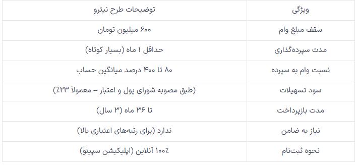 به‌طور خلاصه می‌توان تمام جزئیات طرح نیترو بانک صادرات را در جدول زیر ببینیم.