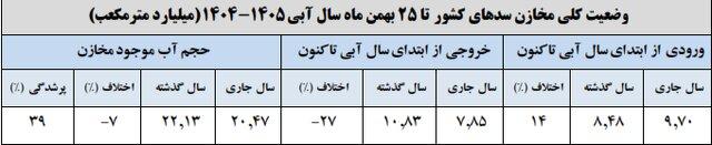 به گزارش ایسنا، همچنین میزان کل خروجی سدهای کشور نیز نسبت به سال قبل با ۲۷ درصد کاهش مواجه بوده است. حجم آب موجود مخازن اکنون ۲۰.۴۷ میلیارد مترمکعب ثبت شده که این عدد نسبت به سال قبل که عددی معادل ۲۲.۱۳ میلیارد مترمکعب بوده ۷ درصد کاهش یافته است. همچنین حجم پرشدگی سدهای کشور نیز تا این تاریخ ۳۹ درصد است.