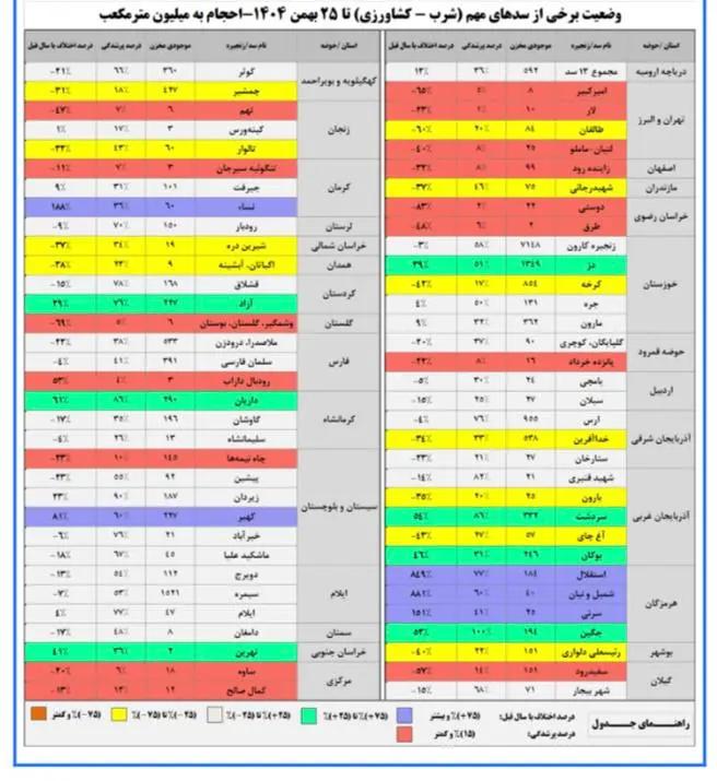 در کل حجم آب موجود در سدها تا ۲۵ بهمن ۲۰ میلیارد و ۴۷۰ میلیون متر مکعب بوده که نسبت به ۲۲ میلیارد و ۱۳۰ میلیون متر مکعب مدت مشابه سال آبی گذشته ۷ درصد کمتر است.
