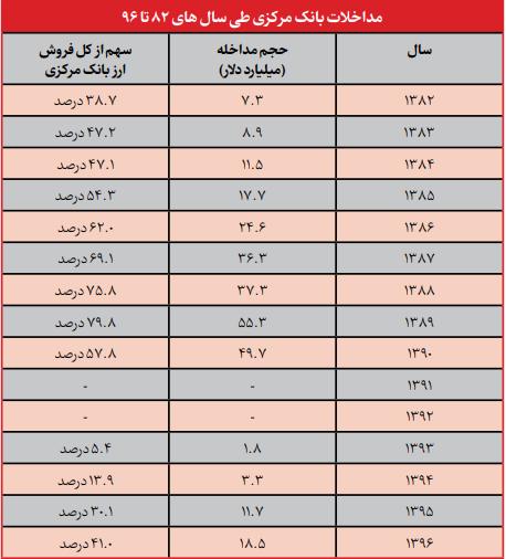 طبق یادداشت ولیالله سیف، رئیسکل اسبق بانک مرکزی، که در ۱۳ آذر ۱۳۹۸ در خبرگزاری ایسنا منتشر شده، بانک مرکزی در فاصله سالهای ۱۳۸۲ تا ۱۳۹۶ مداخلات گستردهای در بازار ارز داشته است. براساس این آمار، تنها در سالهای ۱۳۸۲ تا ۱۳۹۰، حجم مداخله ارزی بانک مرکزی به حدود ۲۴۹ میلیارد دلار رسیده است. (به جدول پیوست گزارش توجه کنید) با وجود این حجم سنگین تزریق ارز، اقتصاد کشور در میانمدت بار دیگر با شوکهای ارزی مواجه شده و نرخ ارز، همگام با تورم، مسیر صعودی خود را ادامه داده است.