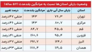 در این میان، استان تهران از جمله استان‌هایی است که فاصله قابل توجهی با میانگین بلندمدت دارد. میزان بارندگی این استان از ابتدای مهر تا یکم اسفند ۷۶.۳ میلی‌متر اعلام شده؛ در حالی که متوسط بارش در دوره بلندمدت ۵۷ ساله ۱۴۳ میلی‌متر بوده و این موضوع از کاهش ۴۷ درصدی بارش‌ها حکایت دارد.
