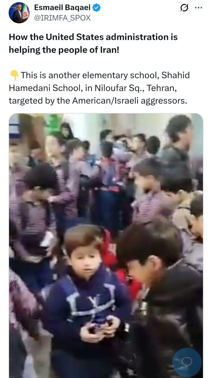 اسماعیل بقائی سخنگوی وزارت امور خارجه با انتشار فیلمی از یکی از مدارس شهر تهران که بر اثر حملات متجاوزان آمریکایی و صهیونیستی آسیب دیده  است، در پیامی در شبکه ایکس نوشت: چگونه دولت آمریکا به مردم ایران کمک می‌کند!