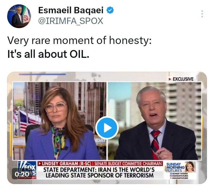 ایران آنلاین: سخنگوی وزارت امور خارجه طی پستی در شبکه ایکس، با به اشتراک گذاشتن فیلمی از اظهارات سناتور لیندسی گراهام، که میگوید: «ونزوئلا و ایران ۳۱ درصد از ذخایر نفت جهان را در اختیار دارند و ما در آنها شراکت خواهیم داشت.»، نوشت: «یک لحظه نادر از راستگویی: مسئله فقط نفت است.»