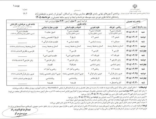 وزارت آموزش و پرورش برنامه امتحانات نهایی خرداد ۱۴۰۵ دانش آموزان را اعلام کرد.