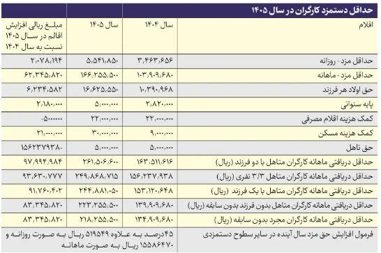 در عین حال حداقل دریافتی ماهانه کارگران متأهل با دو فرزند که در سال ۱۴۰۴ معادل ۱۶۳ میلیون و ۵۱۱ هزار و ۶۱۶ ریال بود، ۹۷ میلیون و ۹۹۴ هزار و ۹۸۴ ریال افزایش یافت و به ۲۶۱ میلیون و ۵۰۶ هزار و ۶۰۰ ریال درسال ۱۴۰۵ رسیده است.