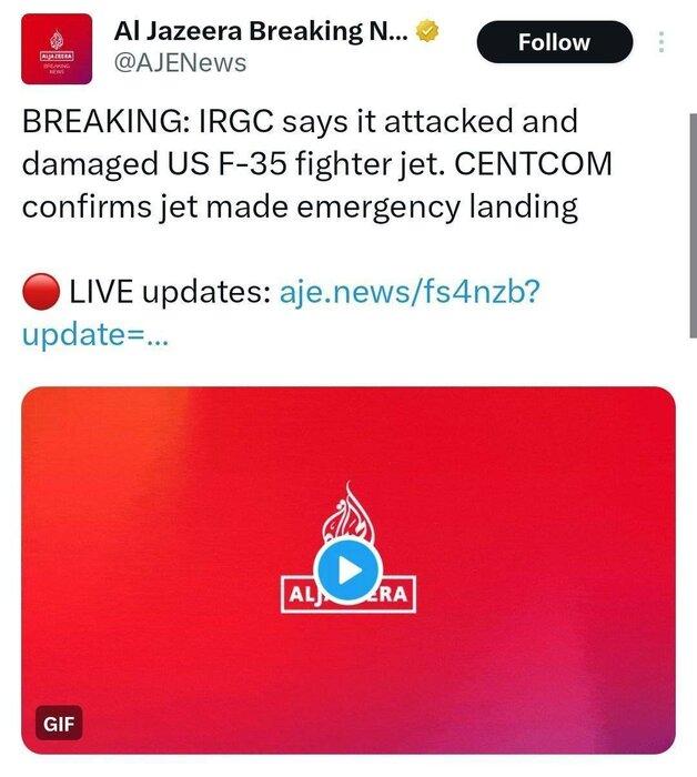 به گزارش ایرنا، همچنین شبکه «الجزیره» در پیامی در حساب کاربری خود در رسانه اجتماعی ایکس (توئیتر سابق) نوشت: سپاه پاسداران انقلاب اسلامی ایران اعلام کرد که یک جنگنده اف-۳۵ را هدف قرار داده است.