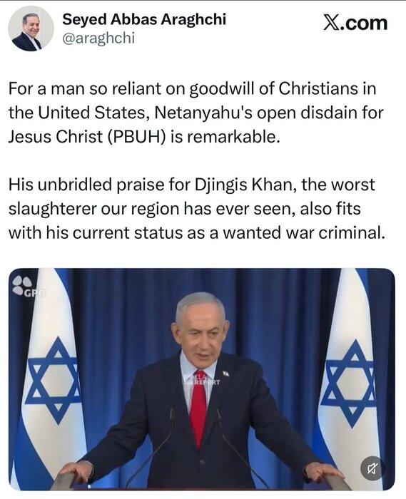 واکنش عراقچی نسبت به تحقیر عیسی مسیح و ستایش چنگیزخان مغول توسط نتانیاهو