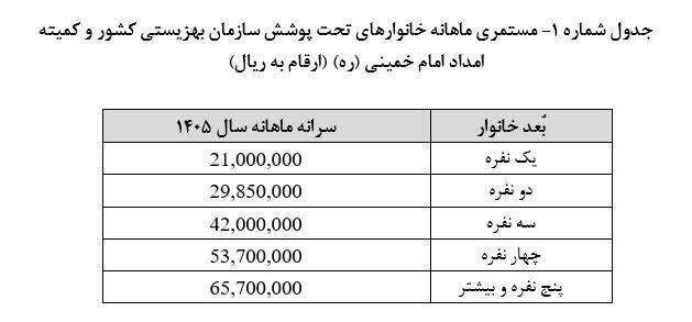 مبالغ مستمری خانوارهای تحت پوشش نهادهای حمایتی شامل سازمان بهزیستی و کمیته امداد بر اساس قانون سال ۱۴۰۵ مشخص شد.
