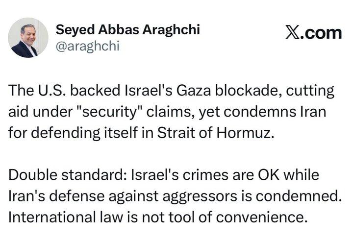 وزیر خارجه ایران در ایکس نوشت: ایالات متحده از محاصره غزه توسط اسرائیل حمایت کرد و با استناد به ادعاهای «امنیتی»، مسیر کمکهای انسانی را مسدود ساخت؛ اما همزمان ایران را بهخاطر دفاع از خود در تنگه هرمز محکوم میکند.