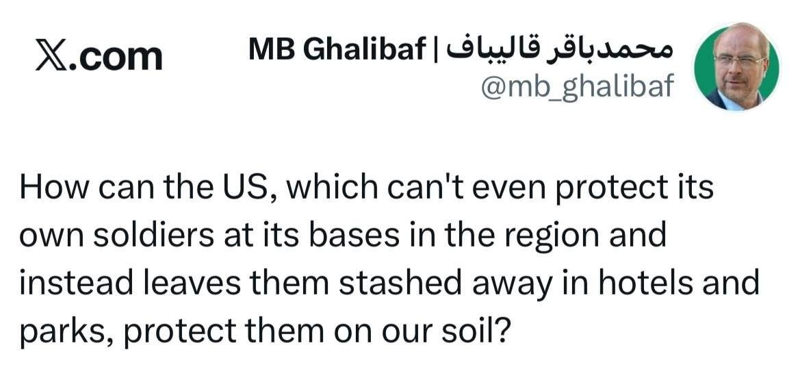 قالیباف در توئیتی به مخفی شدن سربازان آمریکایی در هتل‌ها و مراکز تفریحی کشورهای منطقه کنایه زد.
