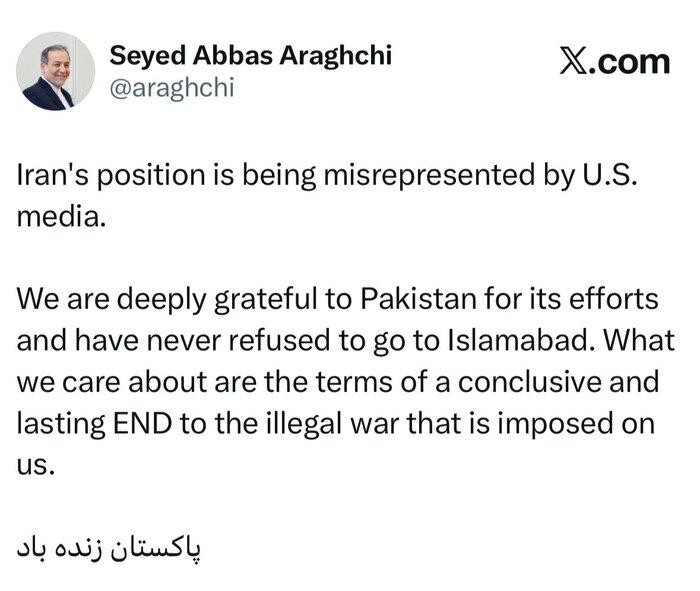 ایران آنلاین: «سید عباس عراقچی» وزیر امور خارجه در شبکه ایکس با اشاره به اینکه رسانههای آمریکایی مواضع ایران را به طور جعلی منعکس میکنند، درباره دیدگاه جمهوری اسلامی ایران درباره میانجیگری پاکستان در جنگ تحمیلی علیه ایران، نوشت: ما قدردان تلاشهای پاکستان هستیم و هرگز از رفتن به اسلام آباد خودداری نکردهایم. (مشکل ما با پاکستان نیست) آنچه برای ما مهم است، شرایط پایان قطعی و پایدار جنگ غیرقانونی و نامشروعی است که بر ما تحمیل شده است. زنده باد پاکستان.