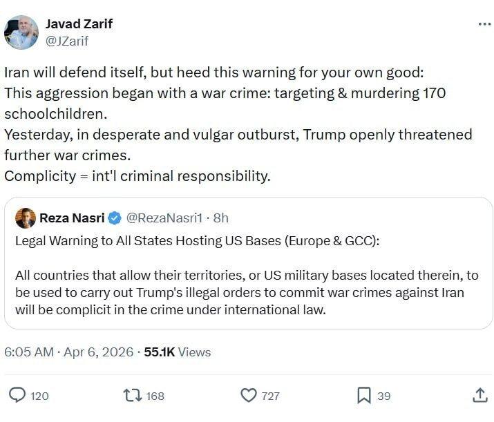 ایران آنلاین: «محمد جواد ظریف» وزیر خارجه پیشین کشورمان در مطلبی در شبکه اجتماعی ایکس خطاب به کشورهای منطقه و اروپا نوشت :«ایران از خود دفاع خواهد کرد، اما برای کمک به خودتان به این هشدار توجه کنید: