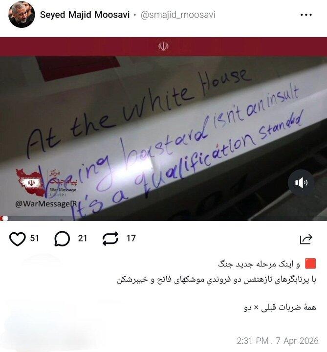 به گزارش ایسنا، بر اساس ویدئوی منتشر شده، روی یکی از موشکهایی شلیک شده در واکنش به اظهارات توهین آمیز اخیر رئیس جمهور آمریکا، در پیامی به زبان انگلیسی نوشته شده است: «در کاخ سفید، حرامزاده بودن توهین نیست، بلکه یک معیار شایستگی است.»