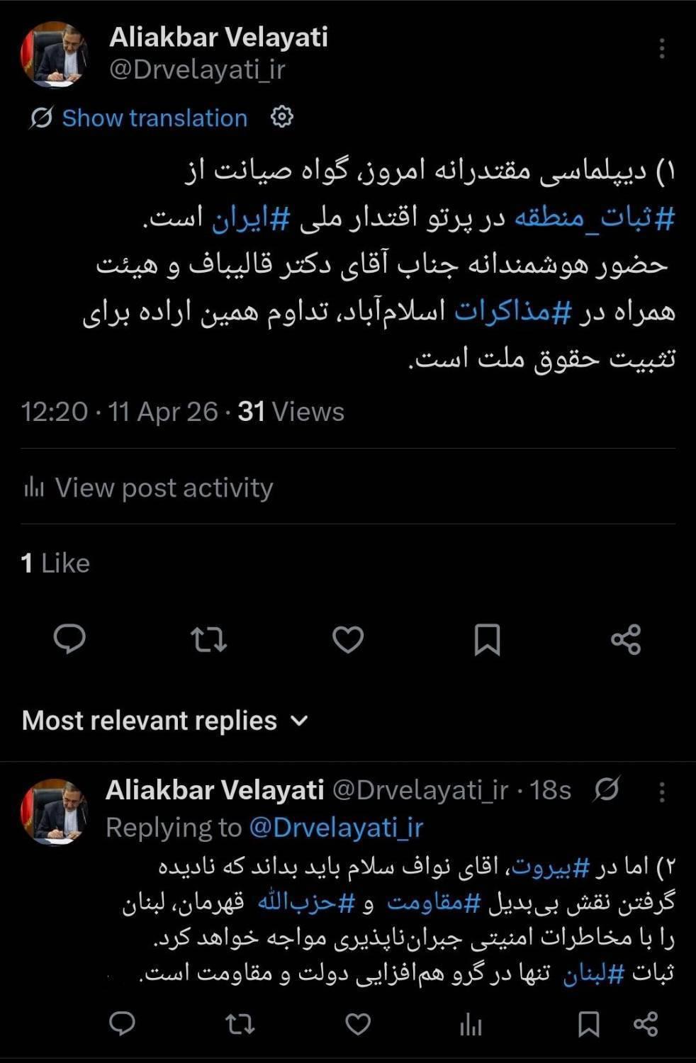 ایران آنلاین: علی اکبر ولایتی در پیامی در فضای مجازی نوشت : حضور هوشمندانه جناب آقای دکتر قالیباف و هیئت  همراه در مذاکرات اسلام‌آباد، تداوم همین اراده برای تثبیت حقوق ملت است؛  اما در بیروت، آقای نواف سلام باید بداند که نادیده گرفتن نقش بی‌بدیل مقاومت و حزب‌الله قهرمان، لبنان را با مخاطرات امنیتی جبران‌ناپذیری مواجه خواهد کرد؛  ثبات لبنان تنها در گرو هم‌افزایی دولت و مقاومت است.