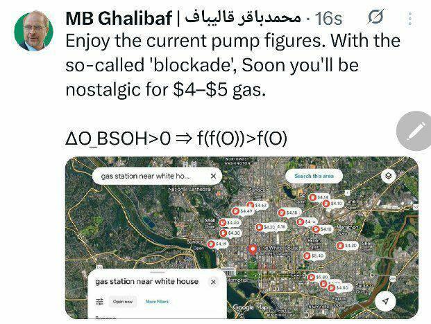 رئیس مجلس در واکنش به تهدید ترامپ به مسدود کردن تنگه هرمز تصویری از آخرین قیمت بنزین در پمپ بنزینهای اطراف کاخ سفید منتشر کرد و نوشت: از قیمت فعلی بنزین لذت ببرید. با آنچه به نام «محاصره» گفته میشود، به زودی دلتان برای بنزین ۴ تا ۵ دلاری تنگ خواهد شد.