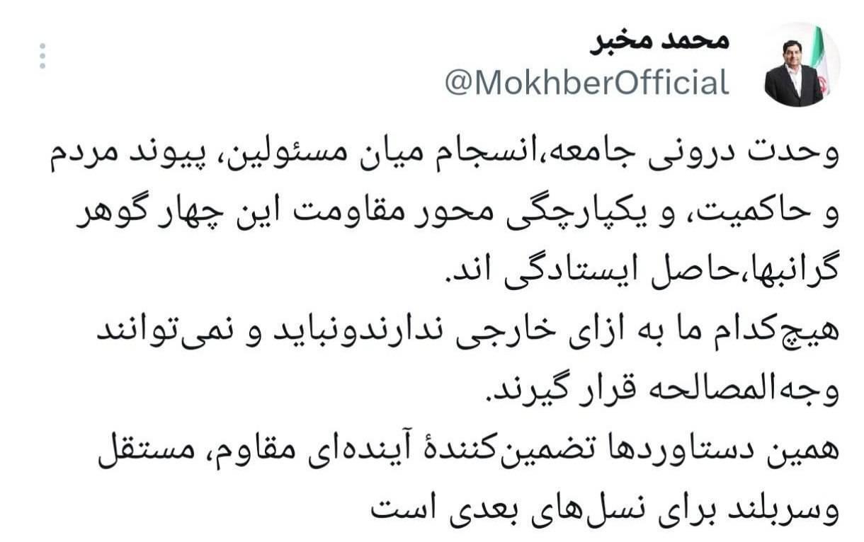 به گزارش خبرگزاری صداوسیما،  محمد مخبر، "وحدت درونی جامعه"، "انسجام میان مسئولین" و "پیوند مردم و حاکمیت" را نیز از جمله گوهر‌های گرانبهایی خواند که حاصل این ایستادگی است.