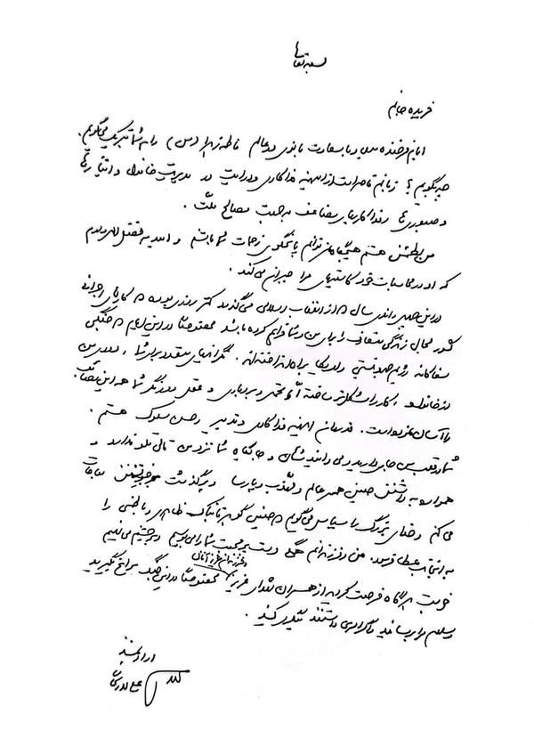 شما در قلب من جا دارید و میدانید شان و جایگاه شما نزد من تالی تلو ندارد و همواره به داشتن چنین همسر عالم و مهذب و پارسا و پر گذشت بر خویشتن مباهات میکنم.