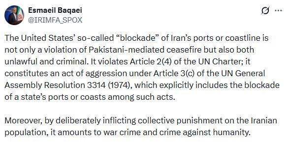 سخنگوی وزارت خارجه نوشت: اقدام ایالات متحده در محاصره بنادر یا سواحل ایران نه تنها نقض آتشبس با میانجیگری پاکستان است، بلکه غیرقانونی و مجرمانه نیز هست.