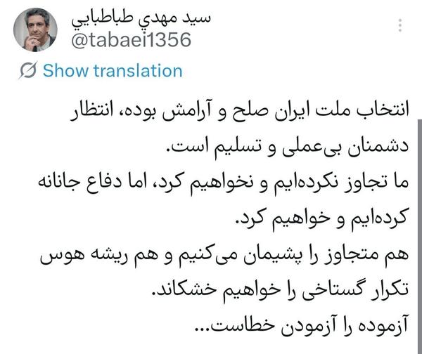 مهدی طباطبایی، معاون ارتباطات و اطلاعرسانی دفتر رئیس جمهور، نوشت: هم متجاوز را پشیمان میکنیم و هم ریشه هوس تکرار گستاخی را خواهیم خشکاند.