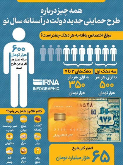 پرداخت طرح کالابرگ دو مرحلهای با هدف کمک به مردم در تأمین نیازهای روزمره منتشر و اعلام شد که طرح کالابرگ در دستور کار دولت قرار گرفته است. در این اینفوگرافیک به مبلغ اختصاص یافته به هر دهک و اقلام شامل این طرح اشاره شده است.
