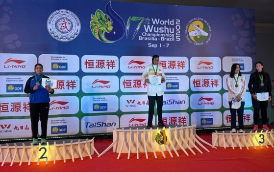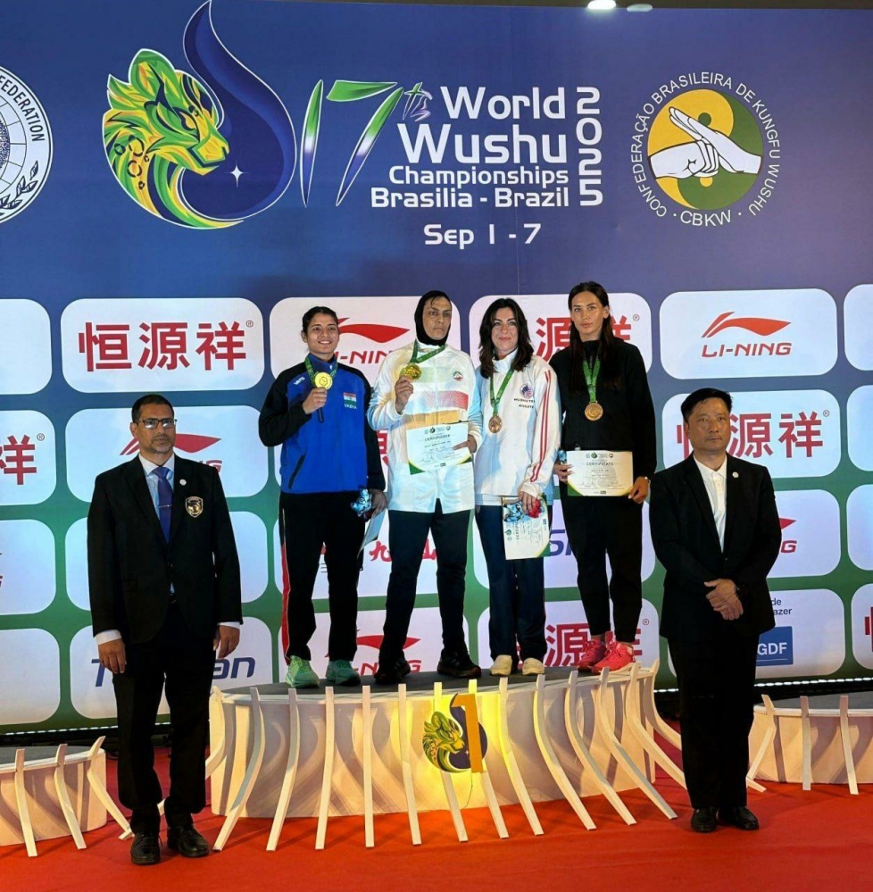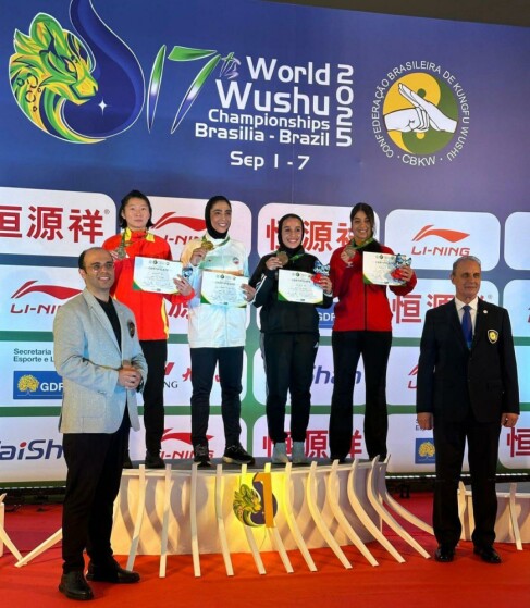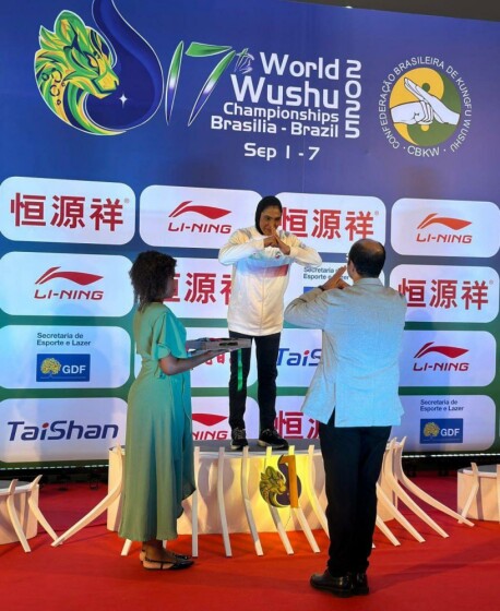 اهدای مدال طلای سهیلا منصوریان قهرمان وزن ۷۰ کیلوگرم ساندا زنان هفدهمین دوره رقابتهای ووشو قهرمانی جهان توسط امیر صدیقی رئیس فدراسیون ووشو ایران و نایب رئیس کمیته کونگ‌فو فدراسیون جهانی ووشو و محمد پورغلامی نژاد عضو کمیته فنی فدراسیون جهانی ووشو