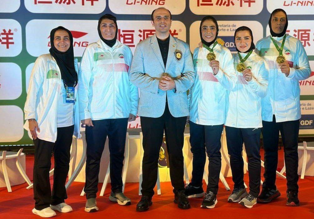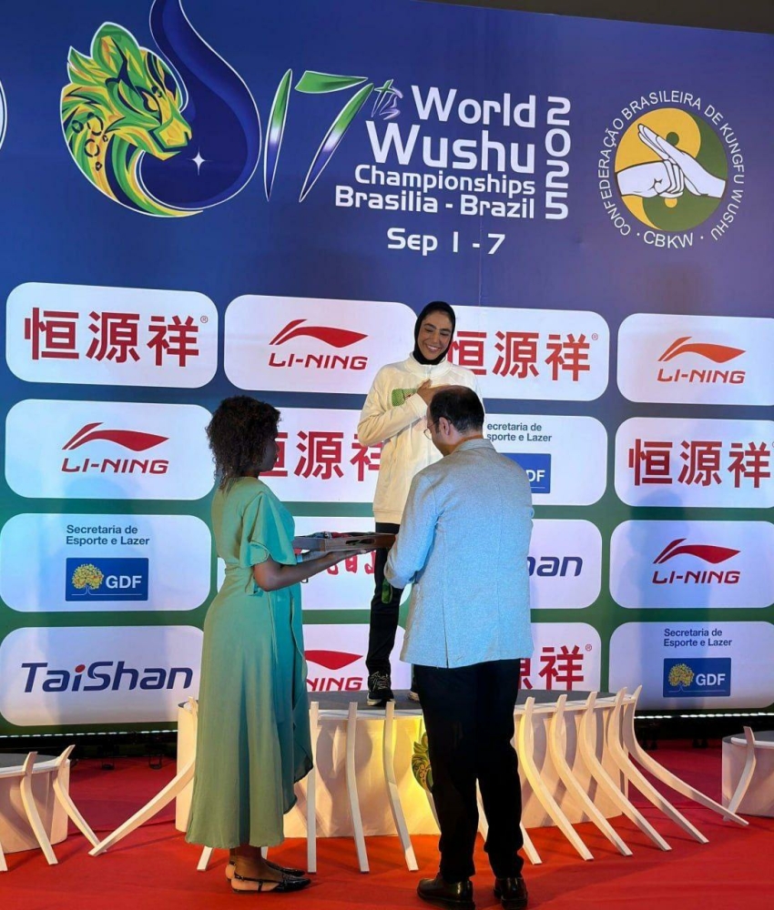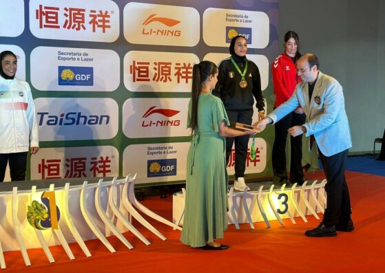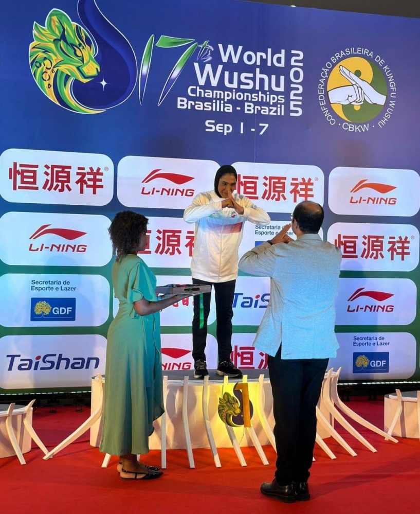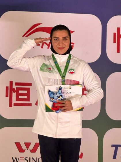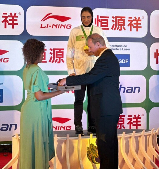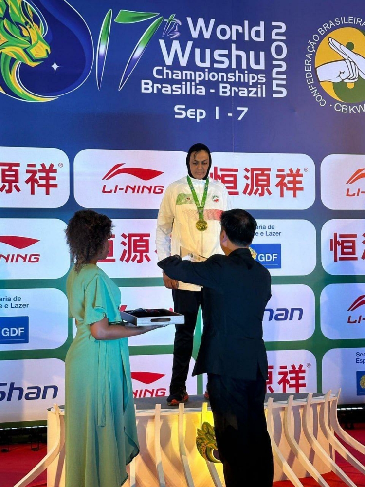 اهدای مدال طلای شهربانو منصوریان قهرمان وزن ۷۵ کیلوگرم ساندا زنان هفدهمین دوره رقابتهای ووشو قهرمانی جهان