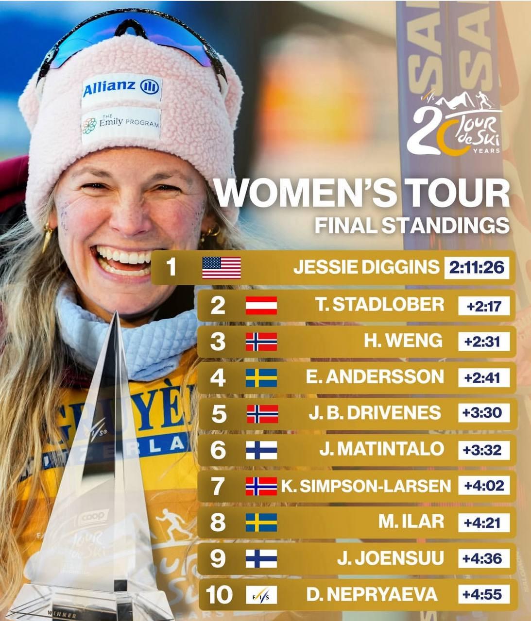 جسی دیگینز، ستاره ۳۴ ساله اسکی صحرانوردی آمریکا، با کسب سکوی دوم در مسابقه ۱۰ کیلومتر استارت جمعی آزاد در وال دی فیمه ایتالیا، برای سومین بار قهرمان تور دو اسکی شد و یک هتتریک تاریخی را به نام خود ثبت کرد.